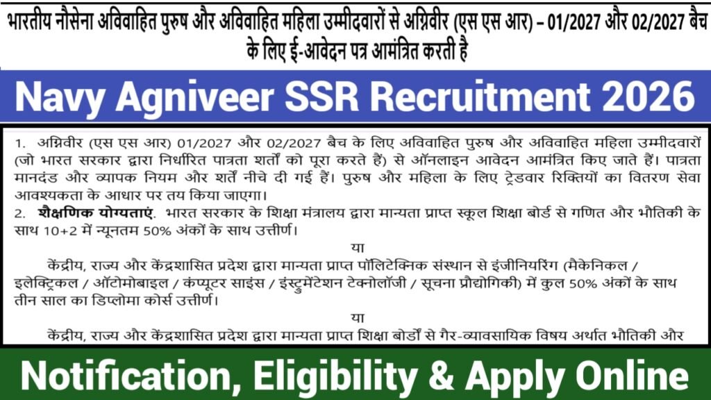 Indian Navy Agniveer SSR Recruitment 2026: The Indian Navy has advertised a recruitment notification for Agniveer Senior Secondary SSR 01/2027 and