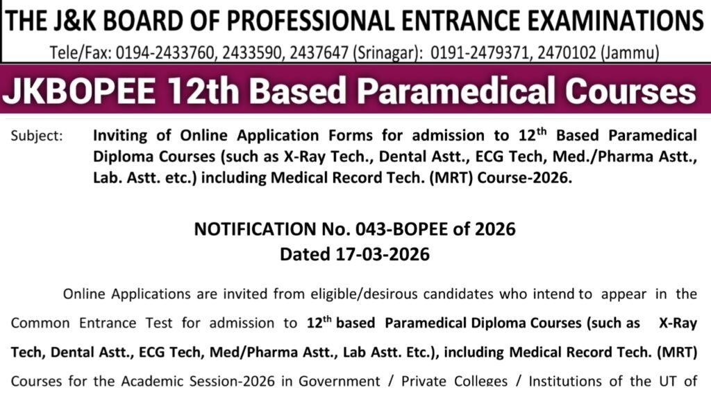 JKBOPEE 12th Based Paramedical Courses 2026 Application Form, Syllabus